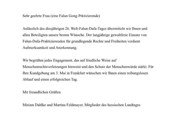 U pismu stoji: „Povodom ovogodišnjeg 26. Svetskog dana Falun Dafe, upućujemo naše najbolje želje vama i svima koji su uključeni. Dugogodišnja nenasilna posvećenost praktikanata Falun Dafe osnovnim pravima i slobodama zaslužuje pažnju i priznanje.”